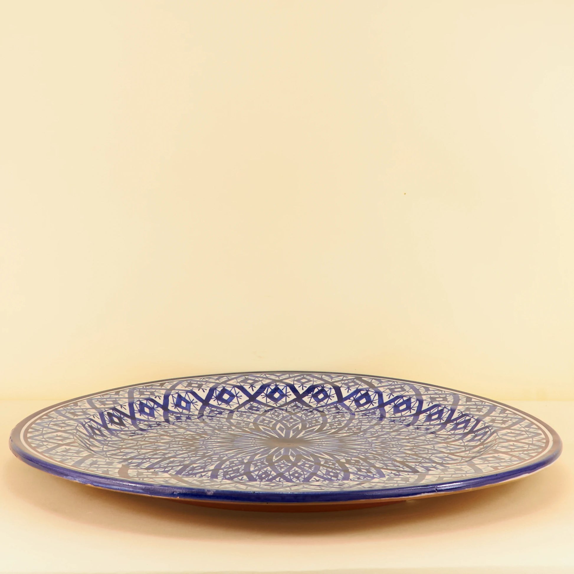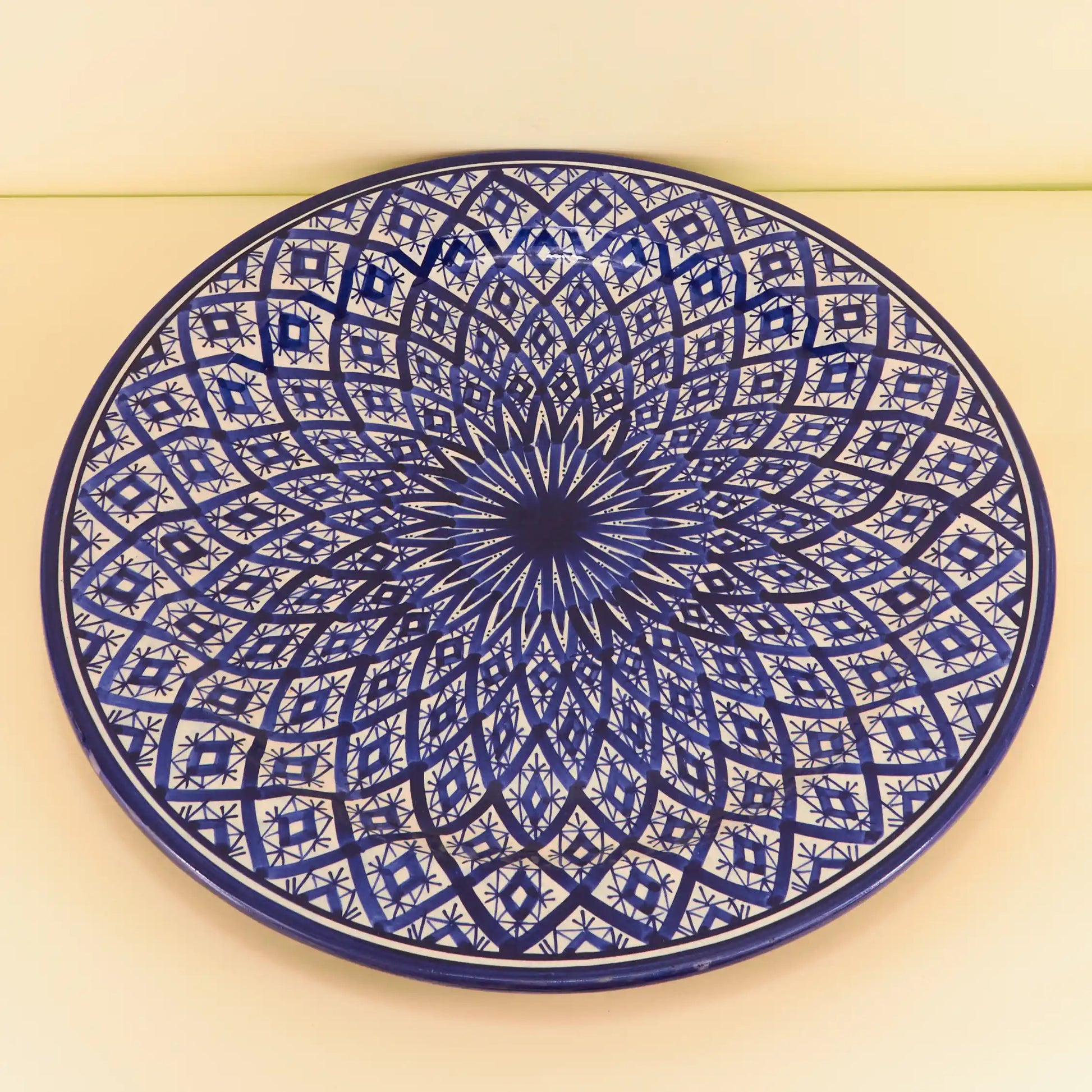 Dit indrukwekkende XXL aardewerk bord met een diameter van 47 cm is handbeschilderd met een prachtig blauw sterpatroon. Gemaakt van hoogwaardig keramiek, straalt het een authentieke oosterse sfeer uit. Perfect als decoratief stuk of voor het serveren van grote maaltijden. Voeg een vleugje elegantie toe aan je interieur.