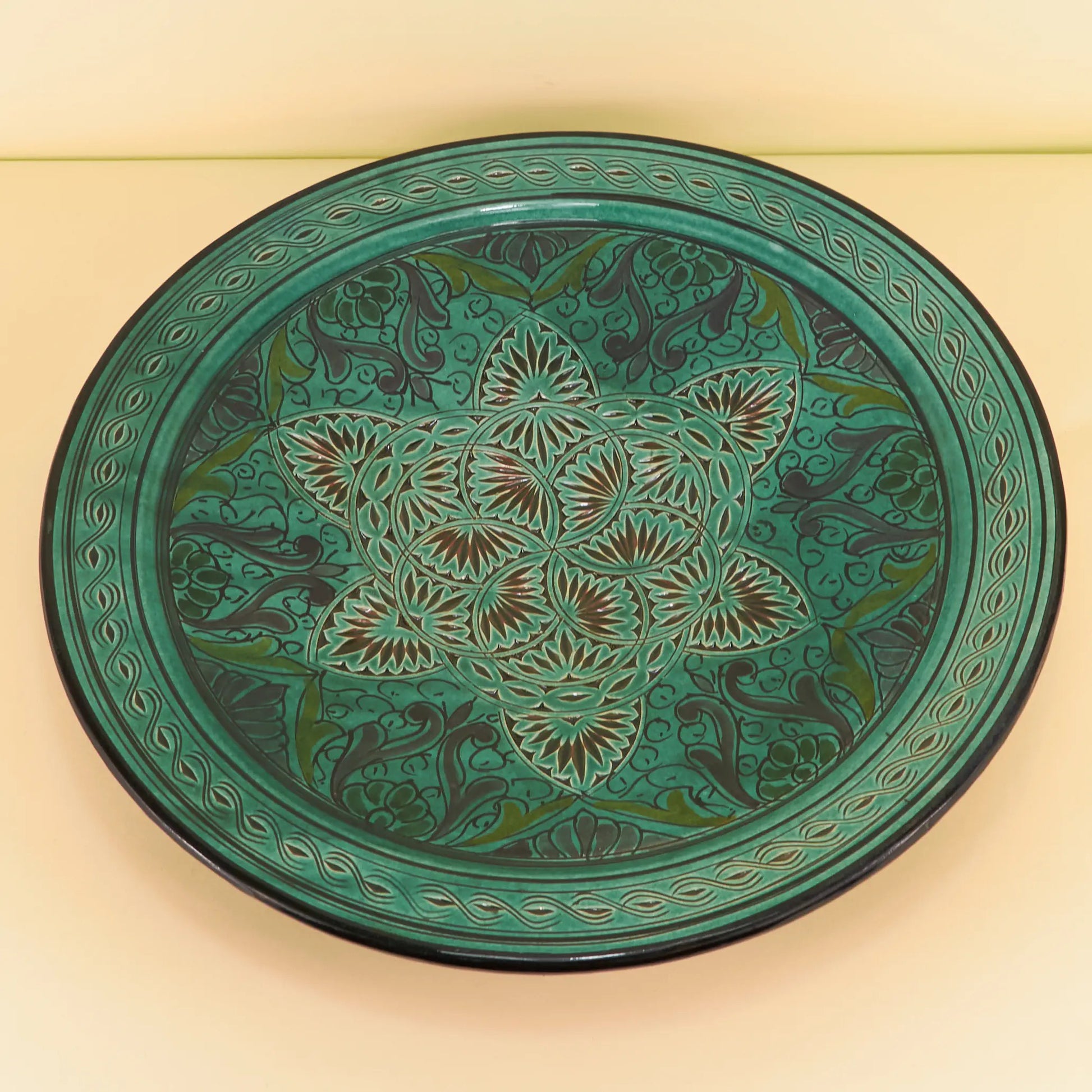 Dit prachtige XL aardewerk bord is met de hand gegraveerd en straalt een oosterse charme uit. De smaragdgroene kleur en verfijnde patronen maken het een uniek kunstwerk. Met een diameter van 45 cm is het ideaal als decoratief stuk of om uw tafel een exotisch tintje te geven. Gemaakt van hoogwaardig aardewerk, het combineert duurzaamheid met esthetiek. Voeg een vleugje elegantie toe aan uw interieur.