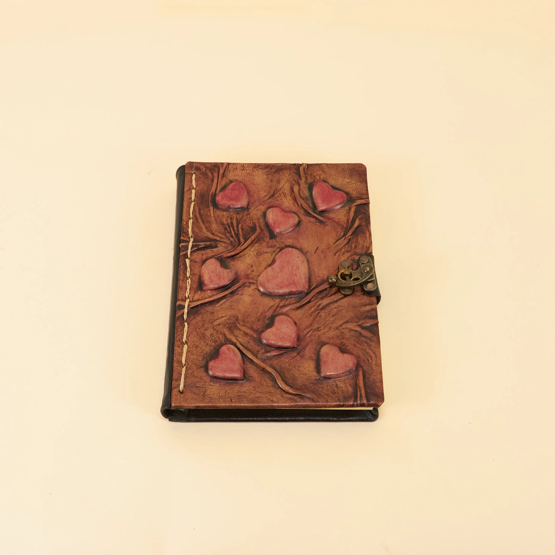 Dit middelgrote dagboek is handgemaakt van hoogwaardig leer en versierd met speelse harten. De warme bruine tinten en het stevige slot geven het een oosterse charme. Perfect voor het vastleggen van je persoonlijke verhalen en dromen. Maak je schrijfavontuur extra bijzonder met dit unieke dagboek!