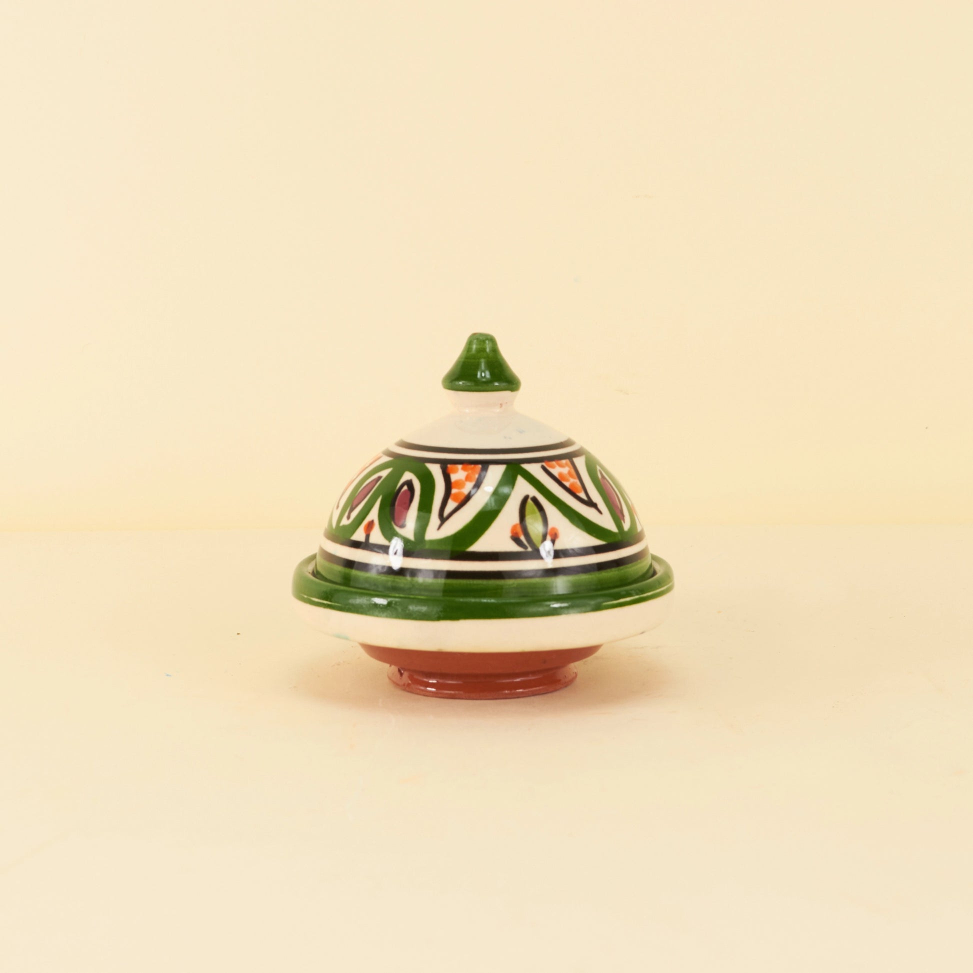 Deze charmante aardewerk tajine, met een levendig groen patroon, is perfect voor het bewaren van zout en suiker. Met een hoogte van 6 cm en een breedte van 10 cm, voegt het een vleugje oosterse stijl toe aan elke keuken. Gemaakt van duurzaam aardewerk, is het zowel functioneel als decoratief. Voeg een exotisch tintje toe aan je dagelijkse routine!