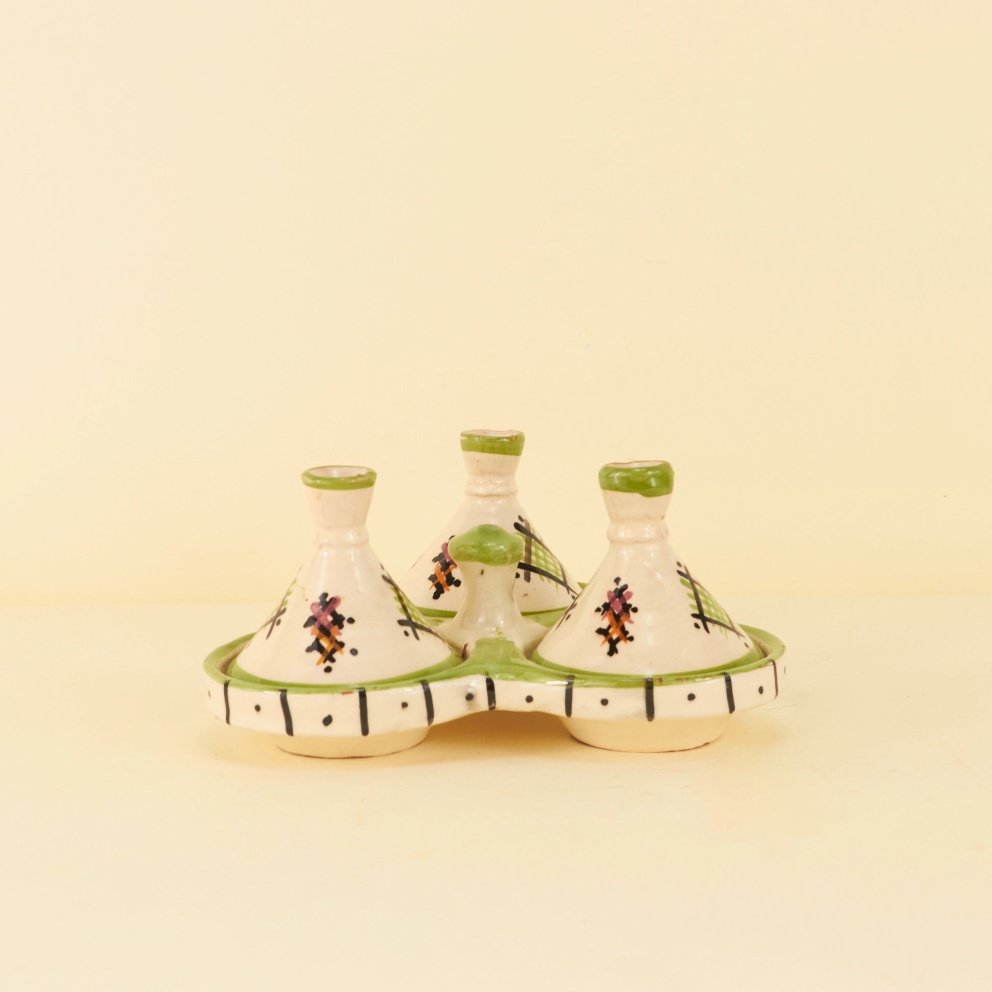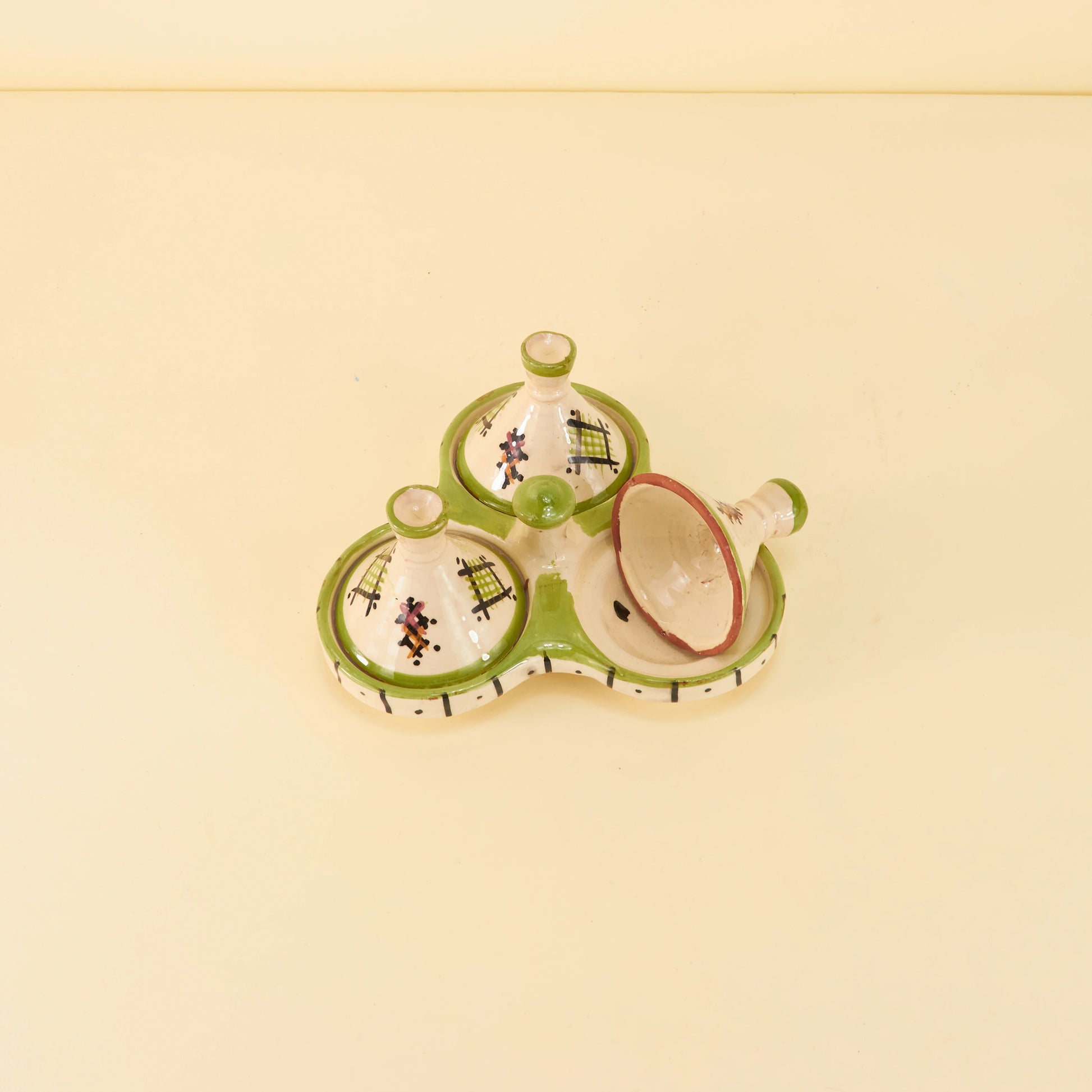 Ontdek de charme van het Oosten met deze handgemaakte aardewerk tajine set. De set bestaat uit drie sierlijke tajines, prachtig versierd met groene accenten en kleurrijke patronen. Perfect voor het serveren van kruiden of als decoratief stuk in uw keuken. Met een breedte van 20 cm en een hoogte van 10 cm, brengt deze set een warme, authentieke sfeer in huis.